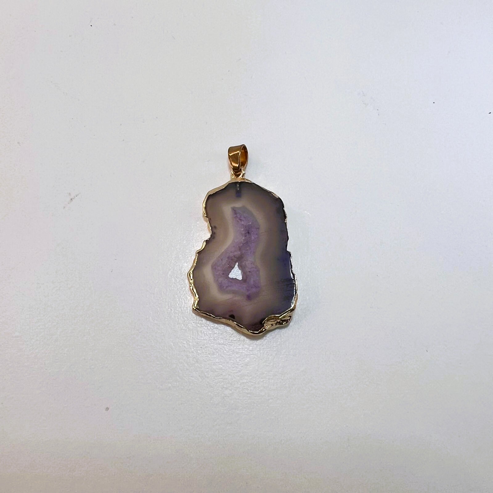 El colgante engarzado en dorado de una geoda de amatista simboliza protección, calma y claridad espiritual. La amatista potencia la intuición, la meditación y la transmutación de energías negativas, mientras que el engarce dorado resalta su energía y aporta un sentido de abundancia y armonía. Es un amuleto que favorece la paz interior, la conexión espiritual y el equilibrio emocional.