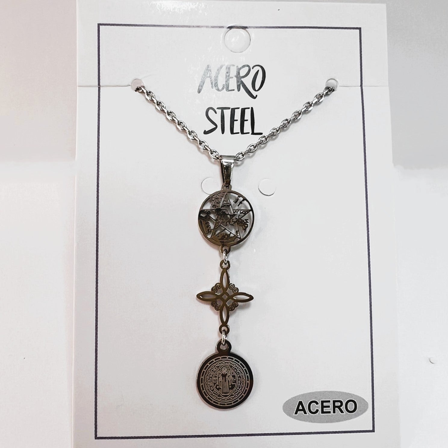 El collar de acero de triple protección con tetragramatón, nudo de bruja y medalla de San Benito es un talismán que une fuerza, protección y equilibrio espiritual su estructura irradia seguridad y armonía mientras los símbolos sagrados y el nudo concentran energías de defensa y claridad sin necesidad de palabras ni rituales cada movimiento o contacto con el collar fortalece la voluntad, purifica el aura y conecta con la protección divina y la sabiduría ancestral
