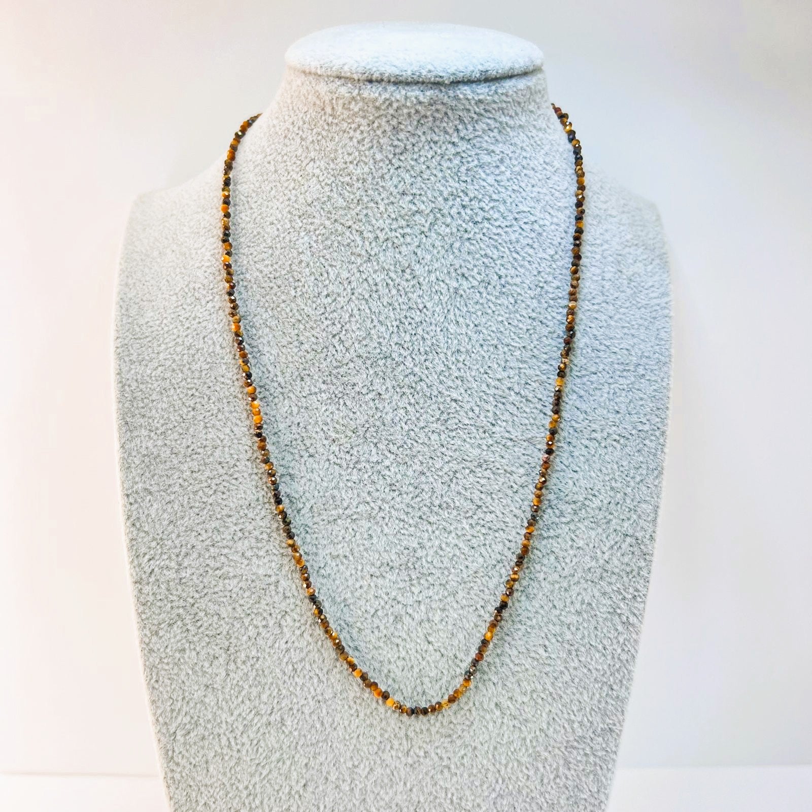 Un collar tipo choker de ojo de tigre es un círculo de poder que se ciñe al cuello como un abrazo de la tierra y del espíritu. El ojo de tigre, piedra de protección y claridad, despierta la valentía del corazón y la visión lúcida de la mente. Al reposar sobre la garganta, activa el chakra de la voz, recordándote hablar tu verdad con firmeza y dulzura, dejando que cada palabra sea un hilo de luz. No es solo adorno: es escudo y guía, equilibrando fuerza y calma, acción e intuición. Quien lo porta camina envuelto en un halo de confianza, protegido por la mirada atenta del tigre sagrado que vigila su camino.