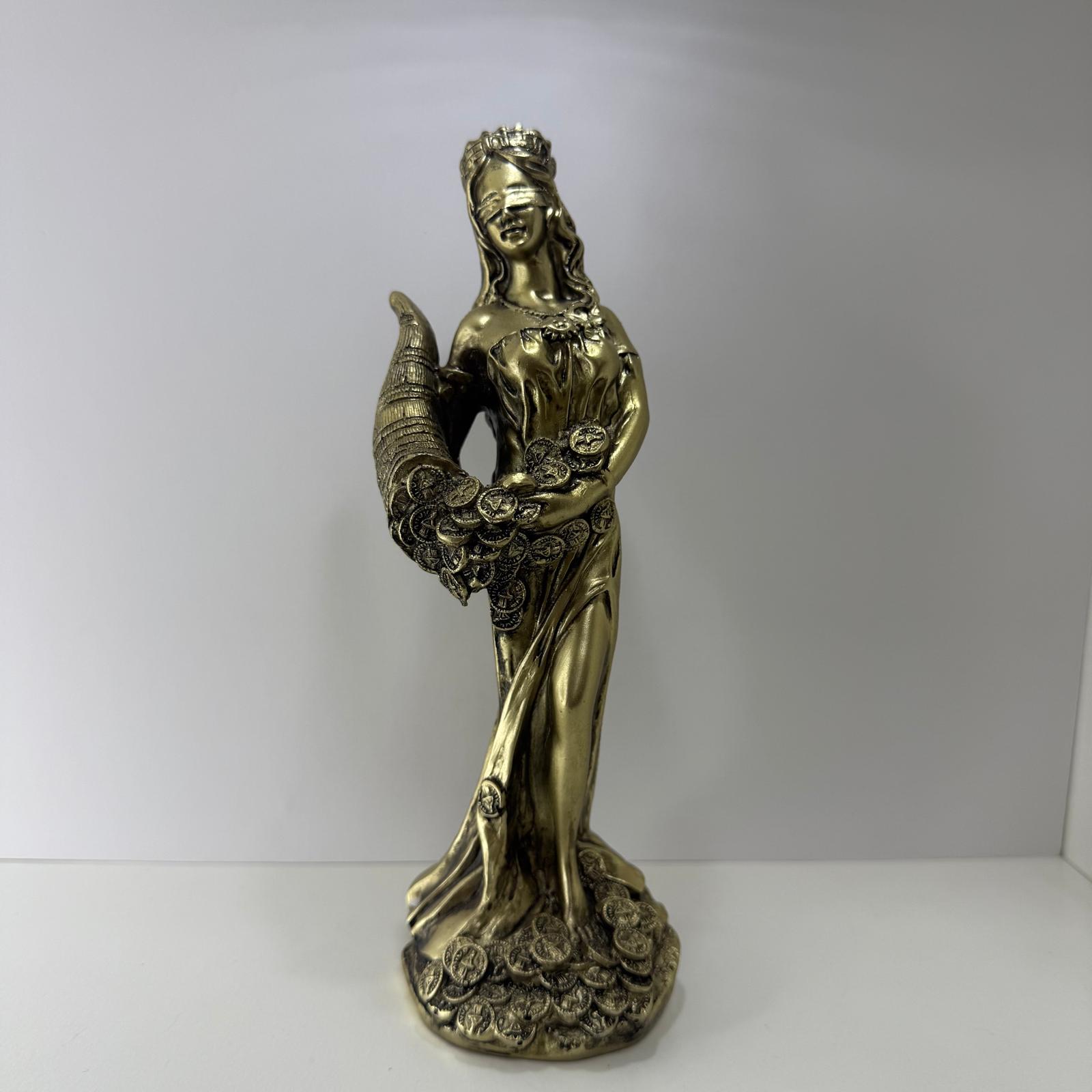 La diosa de la fortuna representada completamente en dorado corresponde a Lakshmi, una de las deidades más veneradas del hinduismo. Ella encarna la riqueza, la prosperidad, la belleza y la abundancia tanto material como espiritual. Suele mostrarse de pie o sentada sobre un loto en plena floración, lo que simboliza pureza y plenitud, mientras vierte monedas de oro de una de sus manos, signo directo de prosperidad inagotable. El color dorado en toda la figura intensifica su relación con la riqueza, la energía divina y la iluminación, convirtiéndola en un símbolo poderoso de fortuna y éxito. Con sus múltiples brazos sostiene a menudo flores de loto, otorgando bendiciones y recordando la importancia de la espiritualidad junto a los bienes materiales.