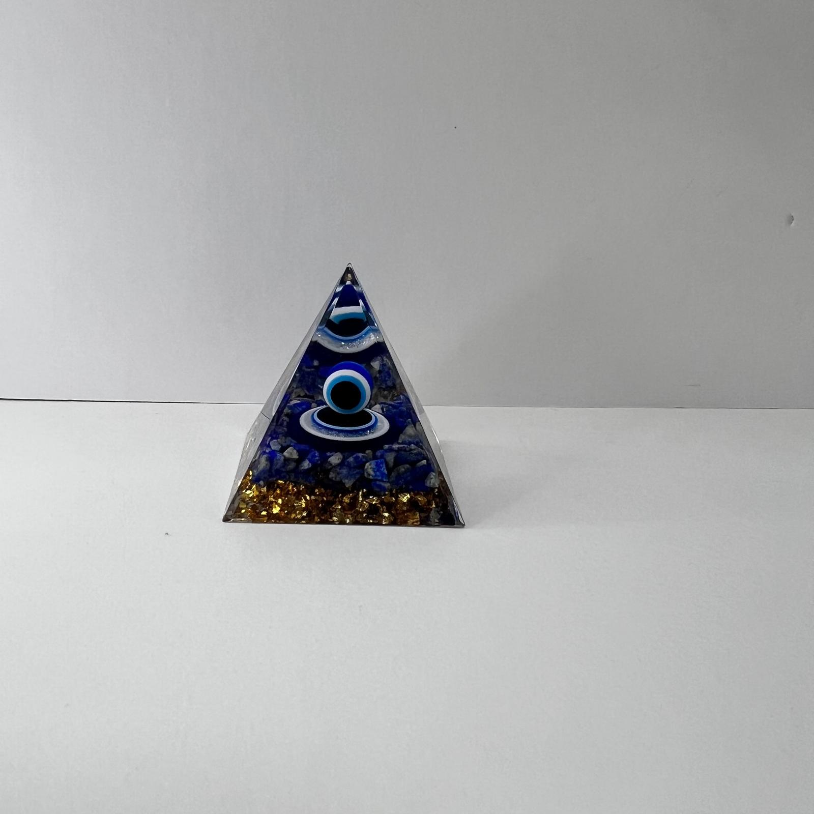 La pirámide de orgonita es un canal de energía que transforma lo denso en luz pura, su forma sagrada eleva y armoniza las vibraciones del entorno, en su interior el lapislázuli con esfera de ojo turco despierta la intuición y la sabiduría interior, protege y atrae energía positiva, juntas crean un flujo de claridad, armonía y protección espiritual envolviendo el espacio y el espíritu en serenidad y luz profunda