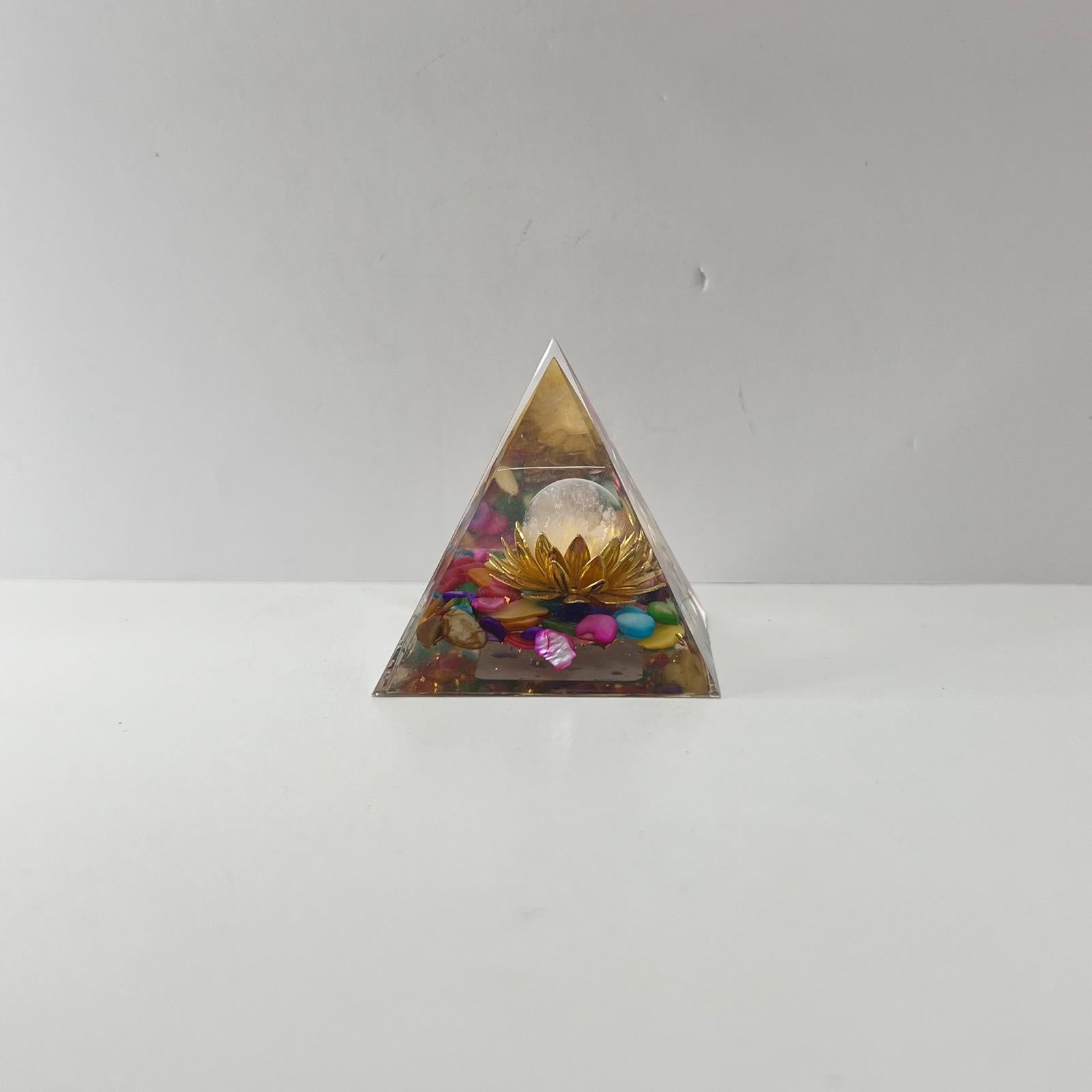 La pirámide de orgonita es un guardián de energía vital que transforma lo denso en luz pura, su forma sagrada eleva y armoniza las vibraciones del entorno, en su interior el ágata multicolor irradia alegría y equilibrio conectando los colores del alma mientras la esfera de cuarzo blanco purifica y amplifica esa energía como un faro de claridad, juntas crean un flujo de paz, protección y renovación espiritual envolviendo el espacio y al espíritu en un manto de calma y elevación