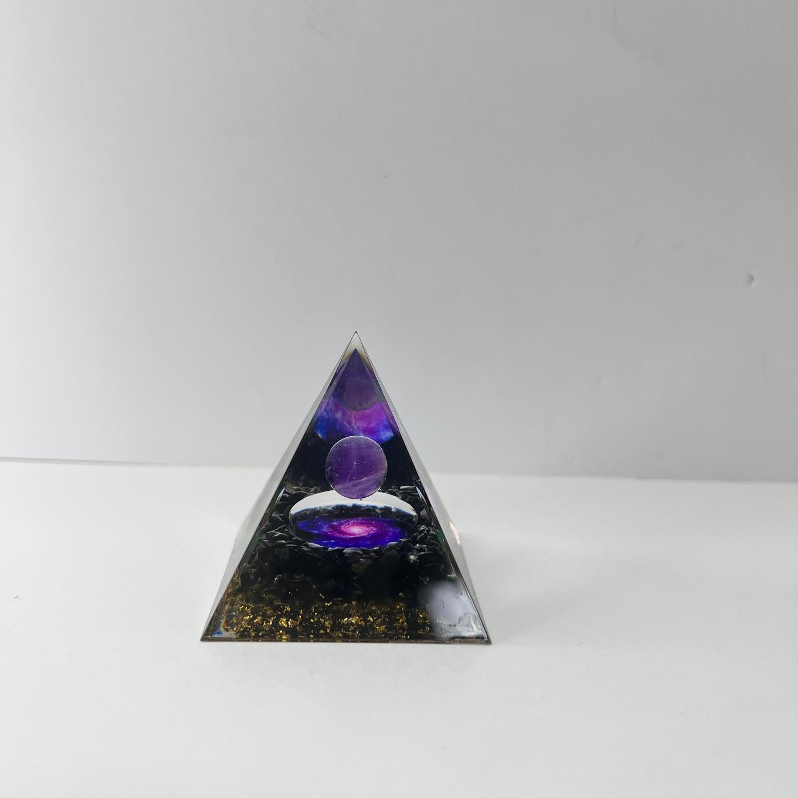La pirámide de orgonita es un canal de energía que transforma lo denso en luz pura, su forma sagrada eleva y armoniza las vibraciones del entorno, en su interior la turmalina con esfera de amatista protege y purifica, disuelve energías negativas y potencia la intuición y la calma espiritual, juntas crean un flujo de seguridad, claridad y conexión profunda con el alma envolviendo el espacio en luz y serenidad