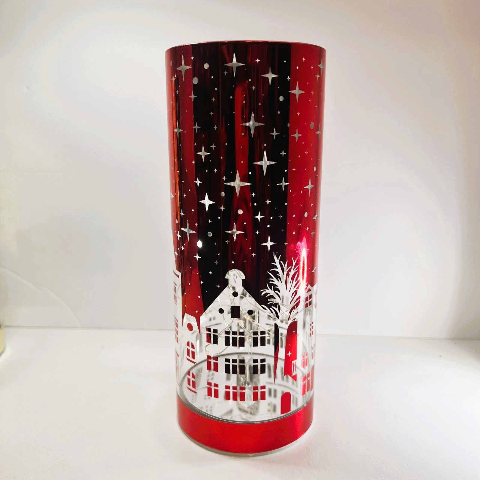 Una lámpara de cristal con motivos de ciudad navideña en tonos rojos se convierte en un pequeño portal luminoso hacia un invierno encantado. A través del vidrio, las casitas rojas parecen respirar calidez en medio del frío, como si cada ventana encendida guardara historias, deseos y susurros de esperanza. La luz que emana del interior envuelve el ambiente con una energía suave y festiva, recordando que incluso en las noches más largas siempre hay un resplandor que guía, inspira y llena el corazón de magia.