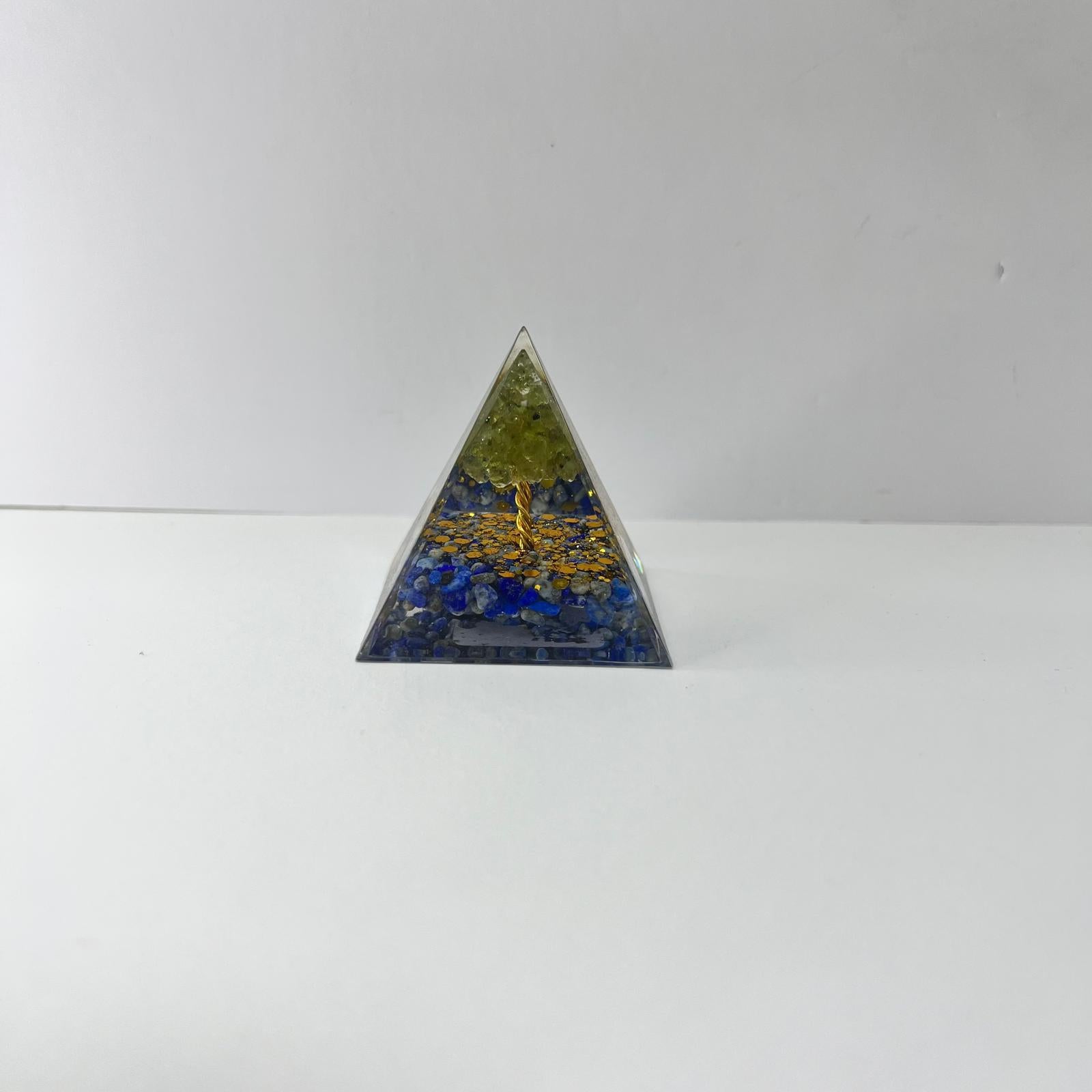 La pirámide de orgonita es un canal de energía que transforma lo denso en luz pura, su forma sagrada eleva y armoniza las vibraciones del entorno, en su interior el lapislázuli con árbol de prehnita potencia la intuición y la claridad mental, aporta sanación emocional y conexión con la sabiduría del espíritu, juntas crean un flujo de protección, equilibrio y armonía envolviendo el espacio y el alma en luz y serenidad