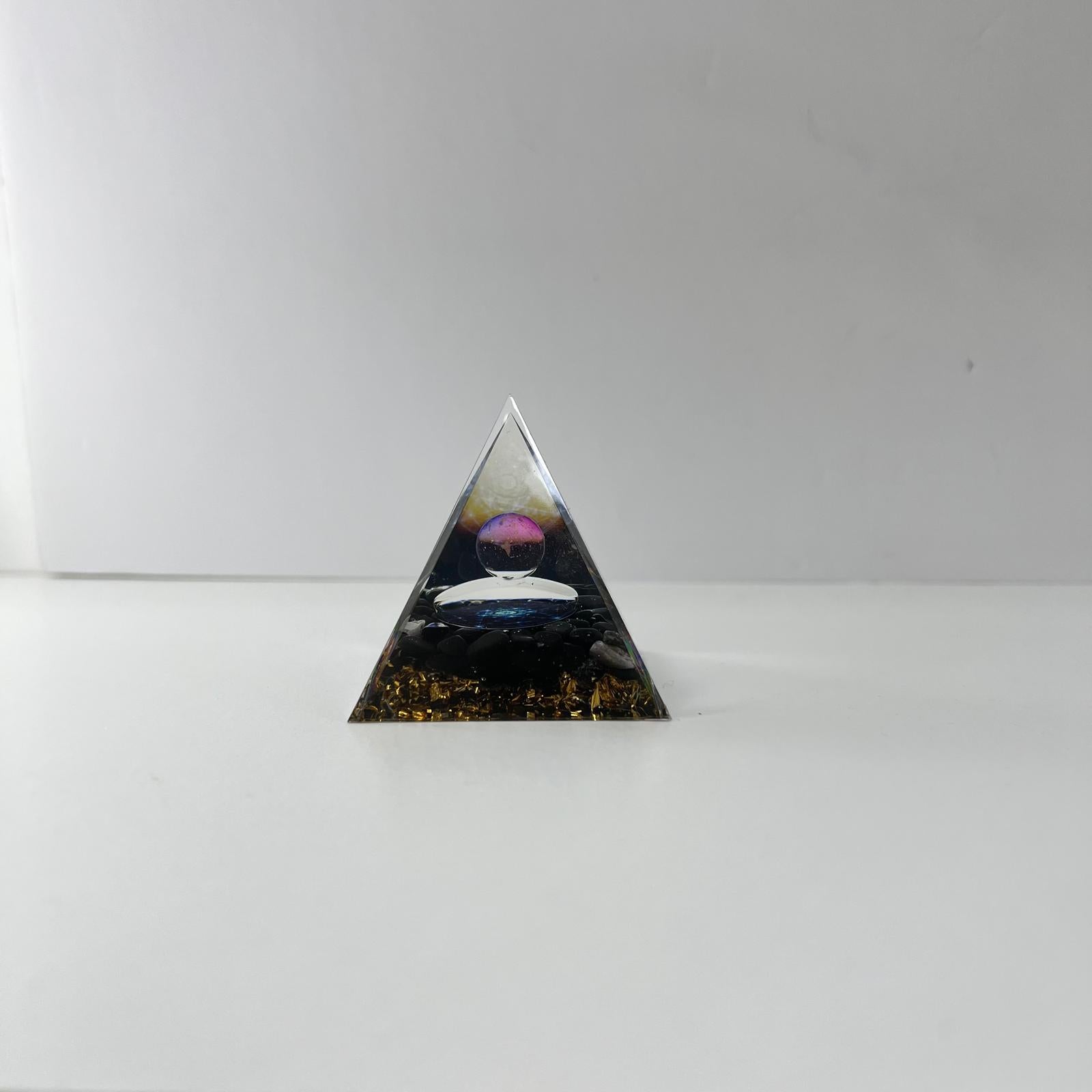 La pirámide de orgonita es un canal de energía que transforma lo denso en luz pura, su forma sagrada eleva y armoniza las vibraciones del entorno, en su interior la obsidiana con esfera de cuarzo cristal protege y disuelve energías negativas mientras el dibujo de pentagrama en azul potencia la conexión espiritual y la protección mágica, juntas crean un flujo de seguridad, claridad y equilibrio envolviendo el espacio y el espíritu en luz, serenidad y fuerza