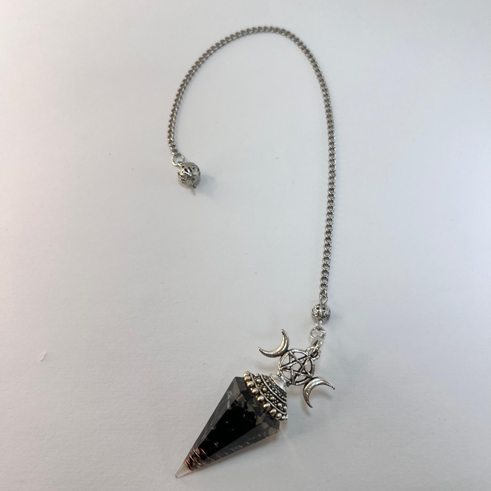 El péndulo punta de orgonita con ónix y enganche de triple luna y pentagrama es un canal de protección y poder que une la fuerza de la tierra con la energía de los ciclos sagrados su cristal absorbe y transforma energías densas mientras el triple símbolo de luna y el pentagrama despiertan conexión con la sabiduría lunar y la armonía universal sin necesidad de palabras ni rituales cada movimiento irradia equilibrio fuerza interior claridad espiritual y alineación con los ritmos del cosmos