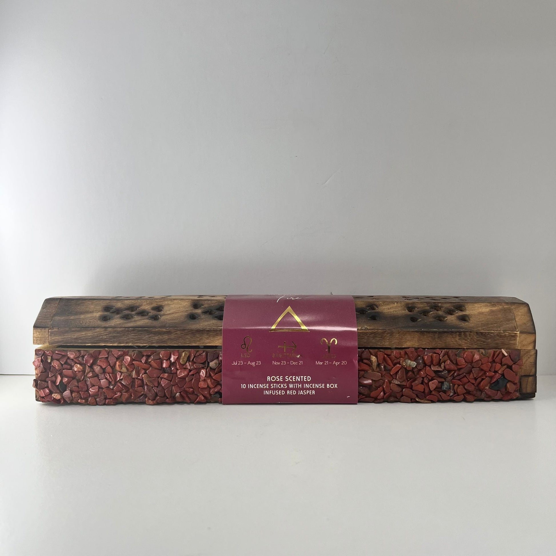 Un baúl incensario con piedras de jaspe rojo decoradas específicamente para los signos Leo, Sagitario y Virgo es un objeto que combina función ritual, protección energética y simbolismo astrológico. El baúl sirve para guardar y quemar incienso, liberando aromas que ayudan a la meditación, la concentración o la limpieza de energías.