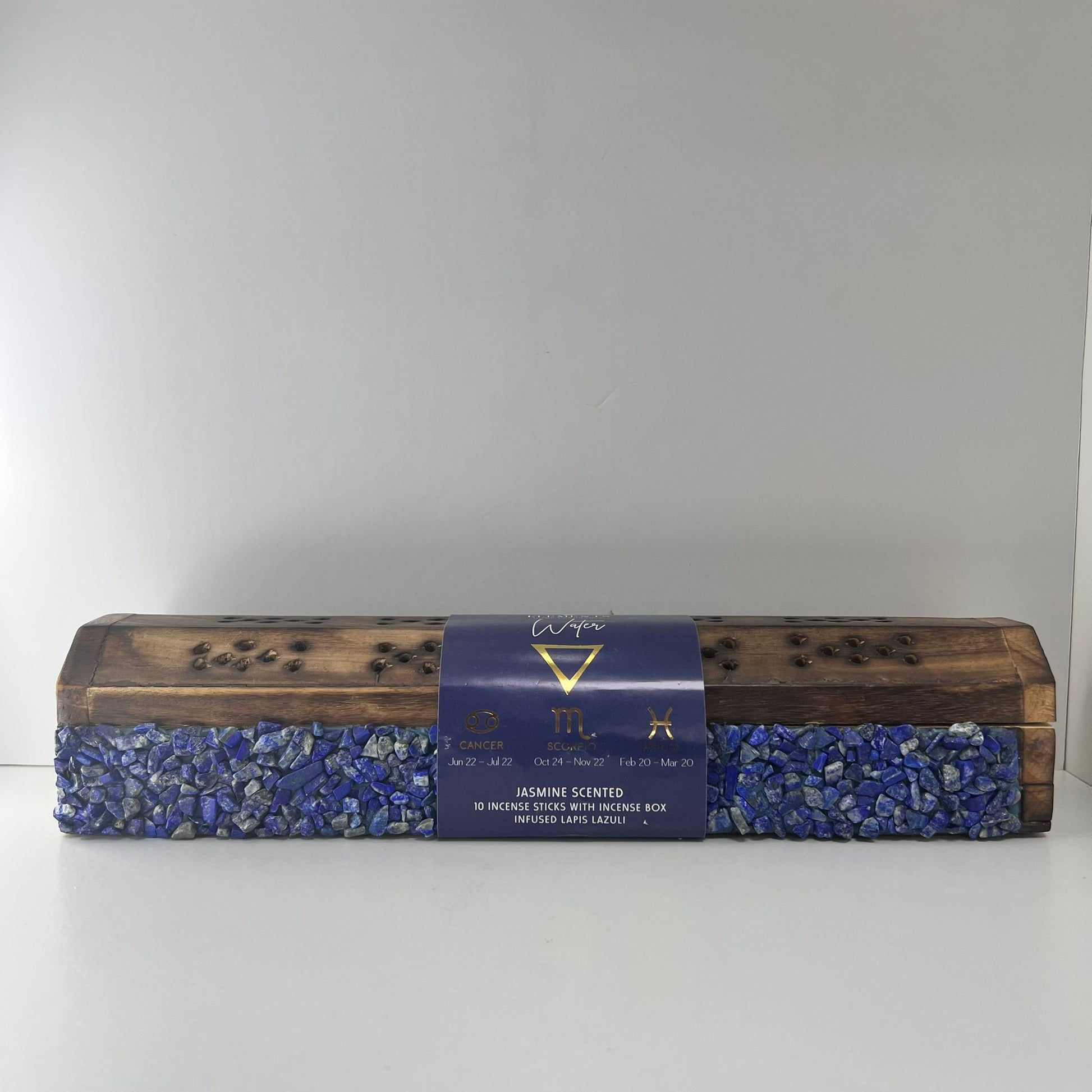 Un baúl incensario con piedras de lapislázuli decoradas para los signos Cáncer, Escorpio y Piscis es un objeto que combina función ritual, protección espiritual y simbolismo astrológico. El baúl se utiliza para guardar y quemar incienso, liberando aromas que facilitan la meditación, la introspección y la limpieza energética.