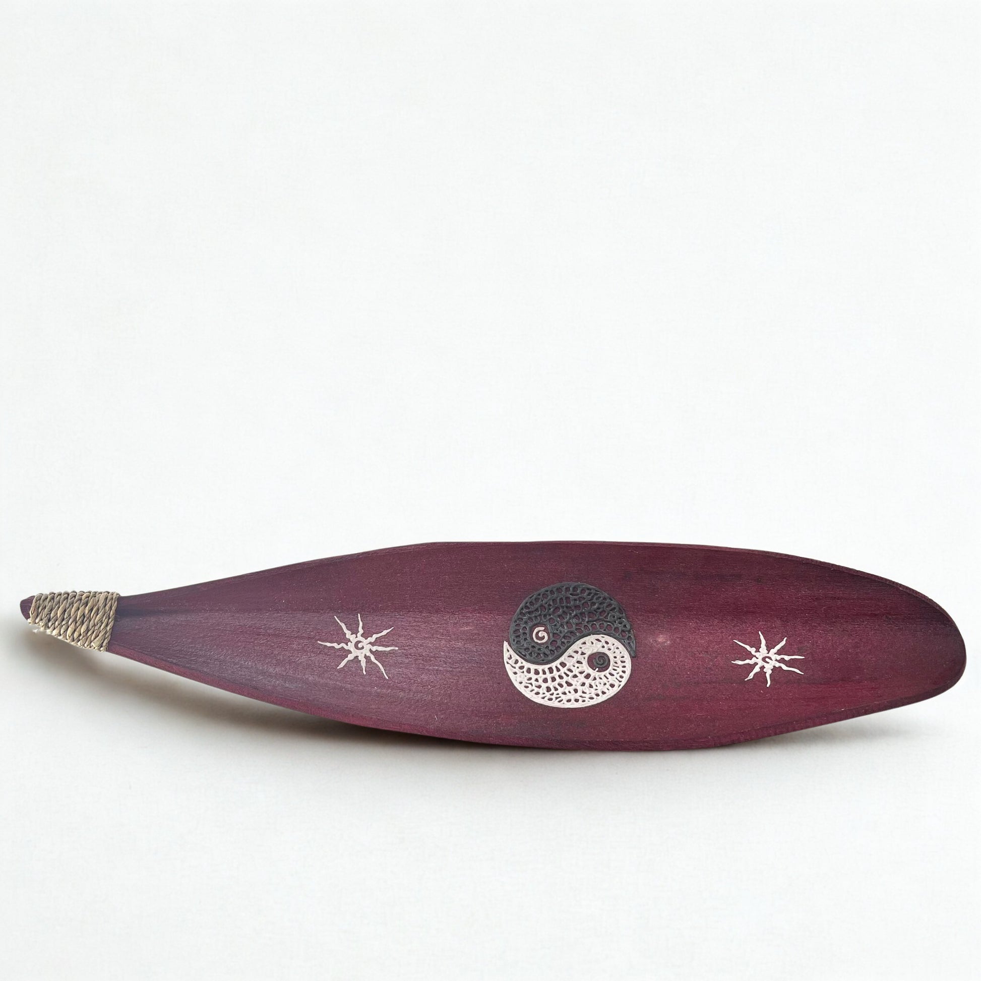 Es un accesorio esotérico y decorativo diseñado para sostener inciensos durante rituales, meditaciones o prácticas de armonización energética. Fabricado con hoja de coco, combina resistencia y estética natural, mientras que el grabado del Yin Yang simboliza el equilibrio, la dualidad y la armonía entre fuerzas opuestas.