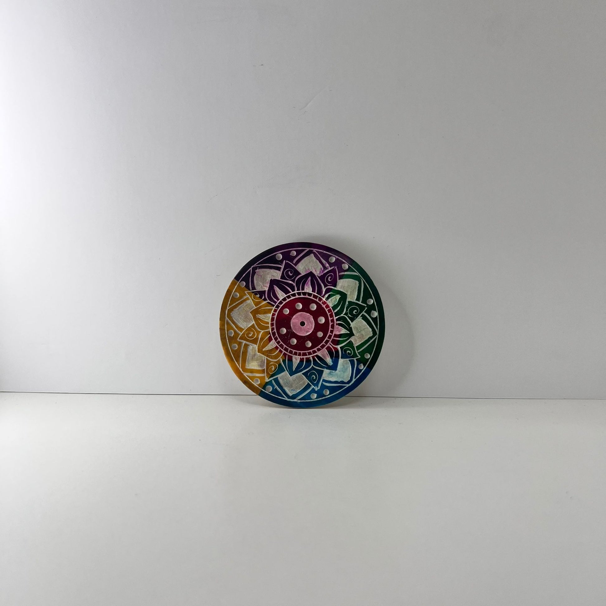 Un platito de piedra de ocho centímetros tallado con dibujos y colores que representan los siete chakras cada tonalidad resplandece como un sello de energía sagrada al posar el incienso en su centro el humo se eleva suave y constante como si recorriera uno a uno los canales del cuerpo encendiendo la vibración de cada chakra este portainciensos es más que piedra es guardián de equilibrio un altar pequeño donde lo material sostiene lo sutil y donde cada aroma despierta la unión entre tierra cuerpo y espíritu