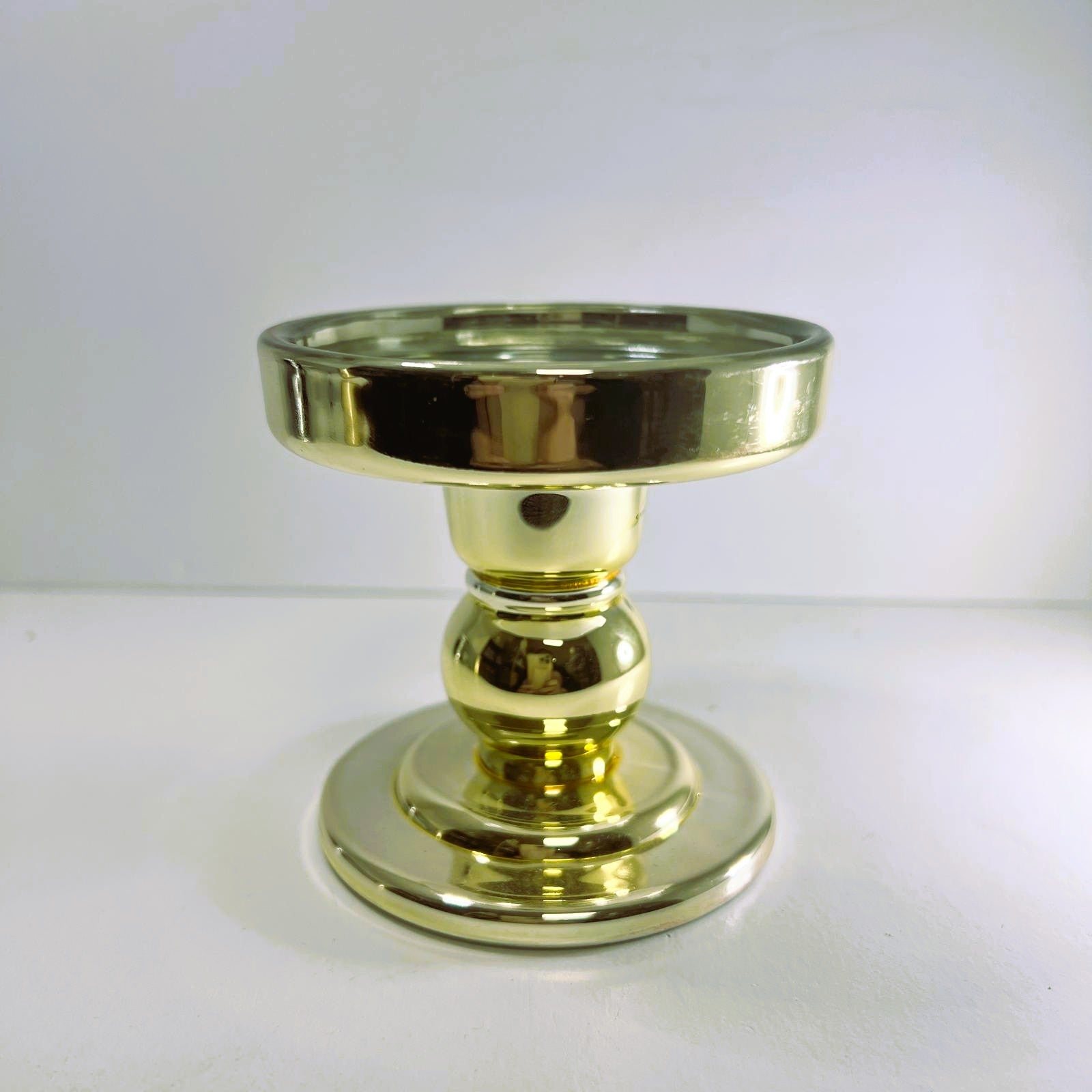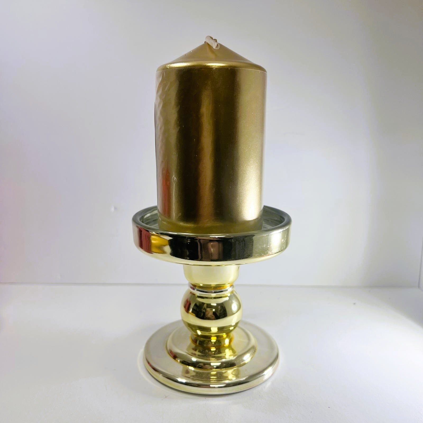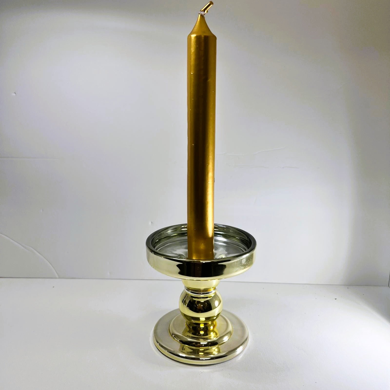 Un portavelas de cristal dorado que irradia una energía cálida y sagrada: su brillo metálico refleja la luz como si fuera un símbolo de abundancia y bendición. El dorado representa sabiduría, protección divina y prosperidad; al encender una vela o un velón sobre él, la intención se ilumina y se expande, creando un espacio de armonía, claridad espiritual y profunda conexión con la luz interior.