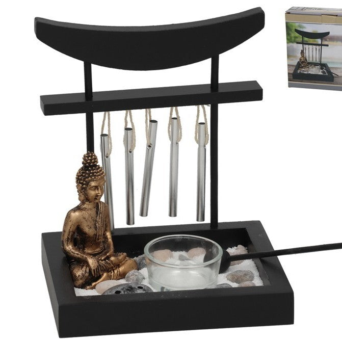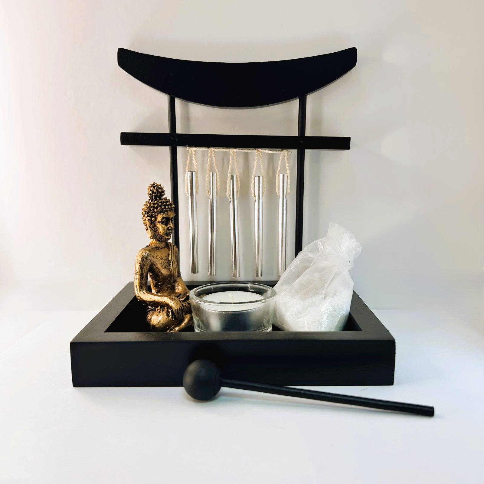 Un portavelas en un jardín zen con Buda, sal, portaincienso y campanillas colgantes es un altar íntimo de calma y despertar; la figura de Buda irradia sabiduría y compasión, la sal purifica el espacio y aleja energías densas, el incienso eleva las oraciones y limpia la mente, y la luz de la vela representa la llama interior que guía en la oscuridad; las campanillas, al moverse suavemente, expanden vibraciones armónicas que disuelven tensiones y atraen serenidad; juntos forman un pequeño universo de equilibrio donde lo sagrado y lo simple se encuentran, invitando al silencio, a la paz interior y al fluir armónico de la energía vital.