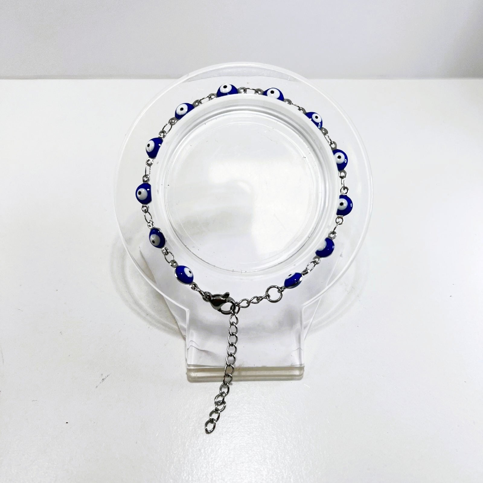 Pulsera de acero con bolitas de ojos azules que invoca la fuerza ancestral del amuleto protector forjada en un material eterno que no se desgasta y resguardada por la energía del nazar símbolo de la mirada que disuelve la envidia y transforma las vibraciones densas en armonía cada bolita azul refleja la profundidad del agua y del cielo recordando el flujo de la vida y la claridad de la conciencia un talismán que acompaña en silencio fortaleciendo el espíritu y envolviendo el camino con luz y resguardo