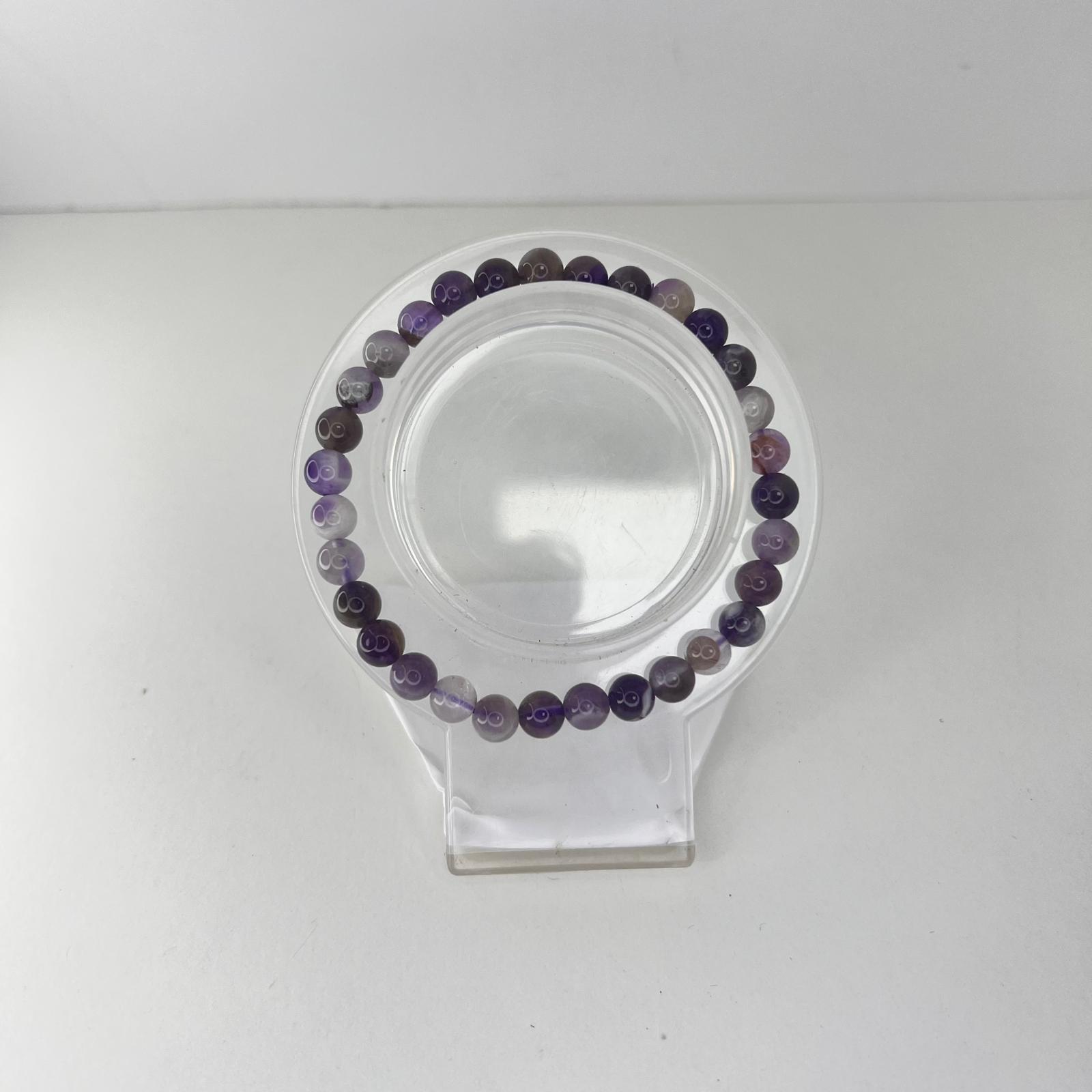 La pulsera de bolitas de amatista es un amuleto de protección, serenidad y claridad espiritual. Sus tonos violetas profundos evocan la calma del crepúsculo y la conexión con planos superiores, invitando a la introspección y la meditación. Se le atribuye la capacidad de equilibrar emociones, reducir el estrés y fortalecer la intuición y la sabiduría interior. Cada esfera es un recordatorio de paz, transformación y claridad mental, guiando hacia el autoconocimiento y la armonía espiritual.