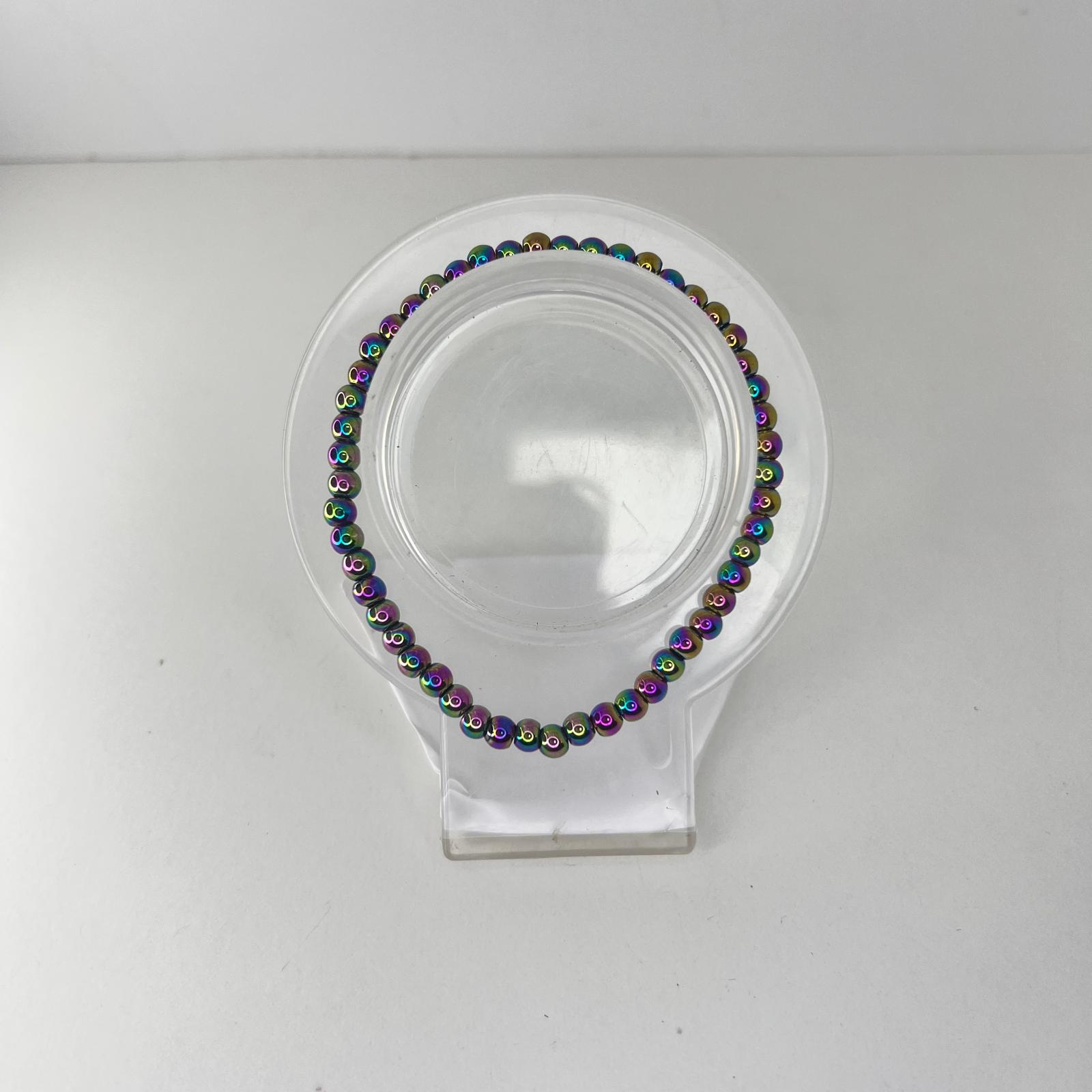 Una pulsera de hematita arcoíris es como portar un universo en miniatura: sus reflejos multicolores despiertan la alegría del alma, mientras la fuerza del hematite brinda arraigo y protección. Es equilibrio entre lo terrenal y lo divino, un talismán que transforma la energía en luz y renovación.