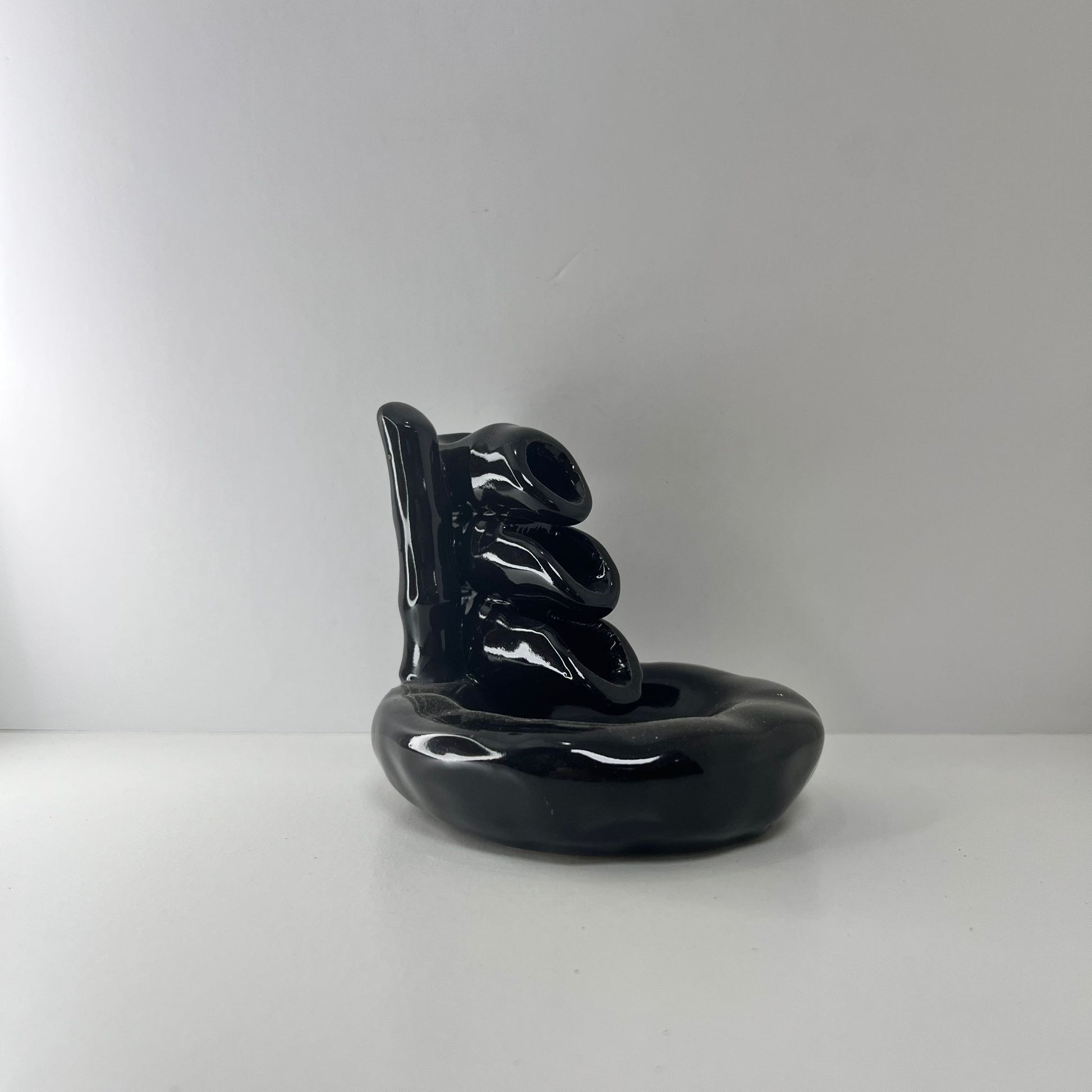 Una fuente de cerámica que representa cañas de bambú dispuestas en forma horizontal como si fueran troncos tendidos en reposo sobre el agua en lo alto descansa el cono de reflujo que al encenderse libera un humo espeso y suave que fluye hacia abajo recorriendo las cañas como un río que se desliza entre ellas el aire se llena de aroma mientras la escena evoca la calma de un bosque después de la lluvia este objeto no es solo una fuente es un símbolo de quietud y equilibrio recordando que hasta en la quietud del bambú horizontal la vida sigue fluyendo con serenidad y fuerza silenciosa