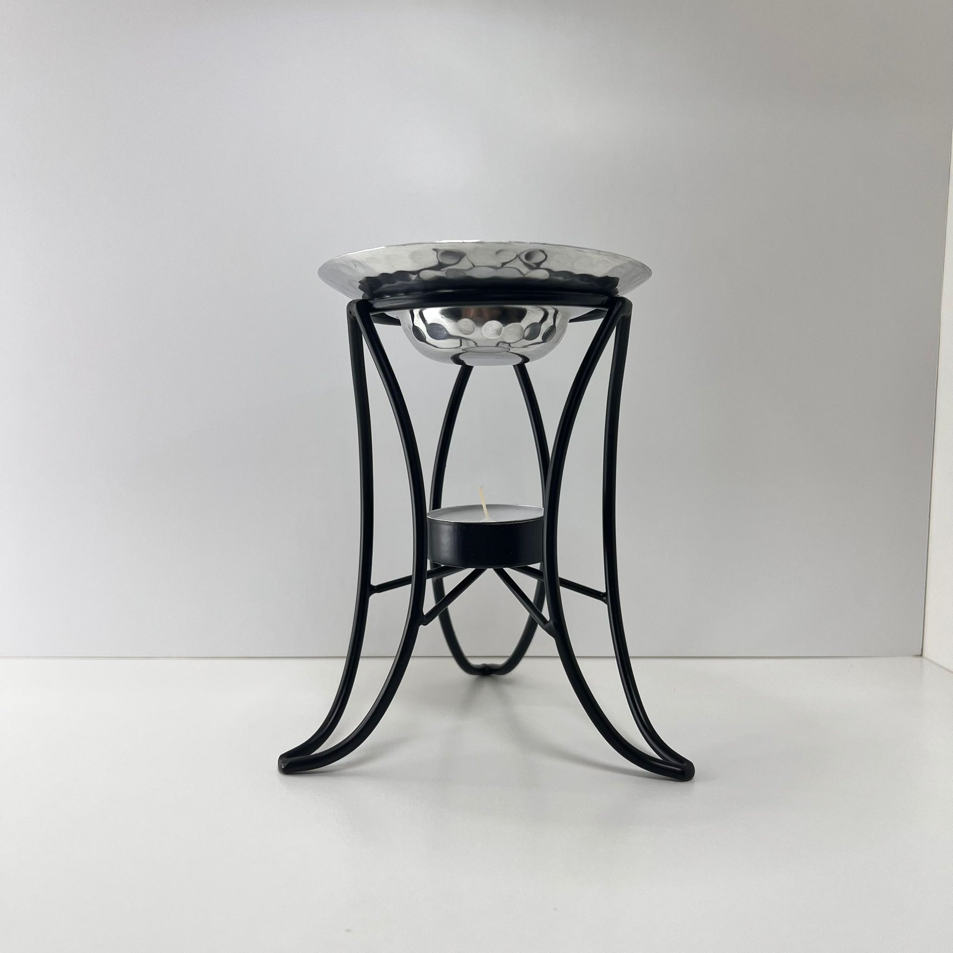 Un quemador metálico con una vela en su interior que calienta suavemente un platito plateado colocado encima donde se pueden poner esencias o aceites al encenderse la vela el calor libera aromas delicados que se elevan en el aire llenando el espacio de fragancia y serenidad