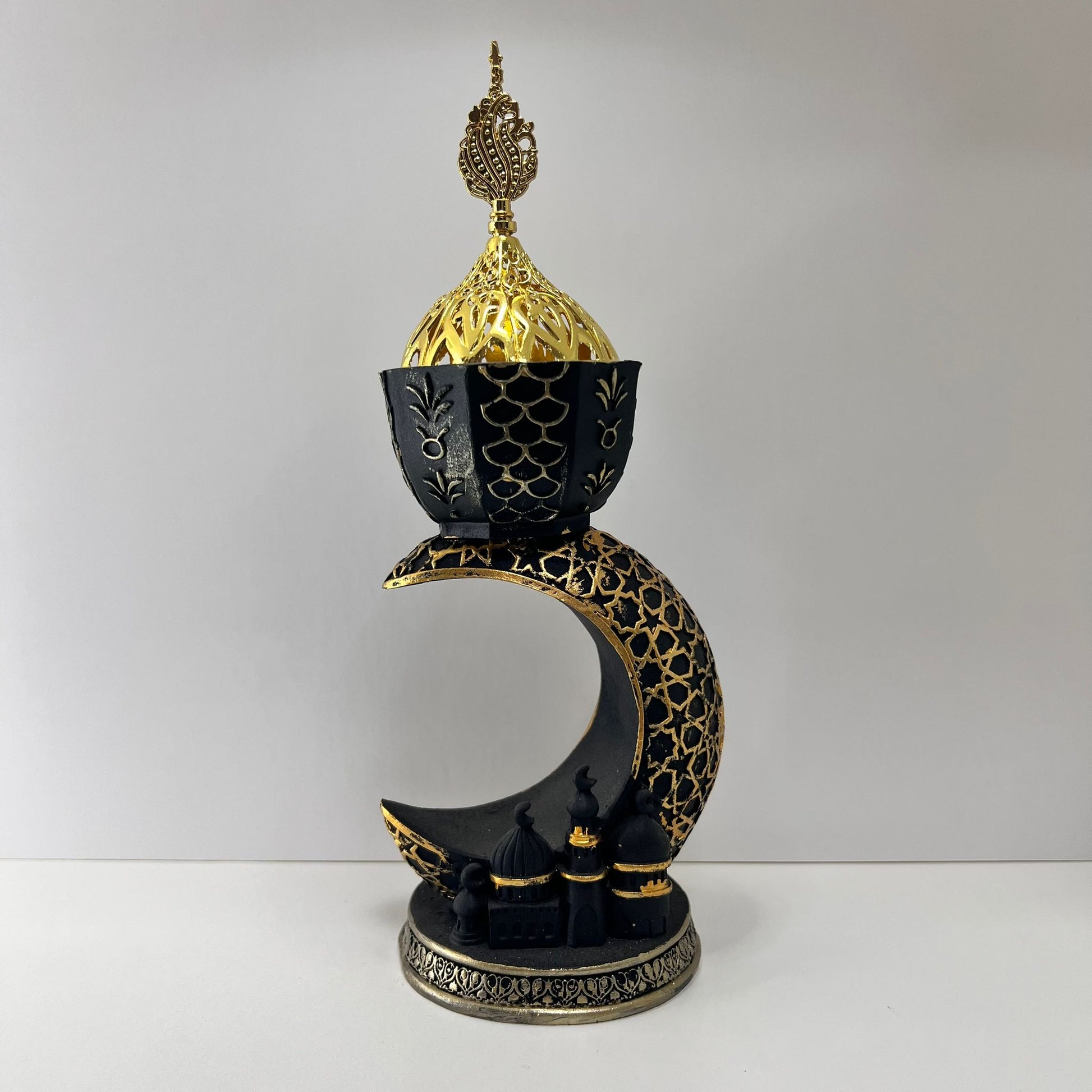 Este quemador de incienso combina la delicadeza de la luna creciente con un diseño inspirado en la estética árabe, evocando misterio y espiritualidad. Su forma permite que el humo del incienso ascienda suavemente, formando remolinos etéreos que transforman cualquier espacio en un ambiente mágico y sereno.