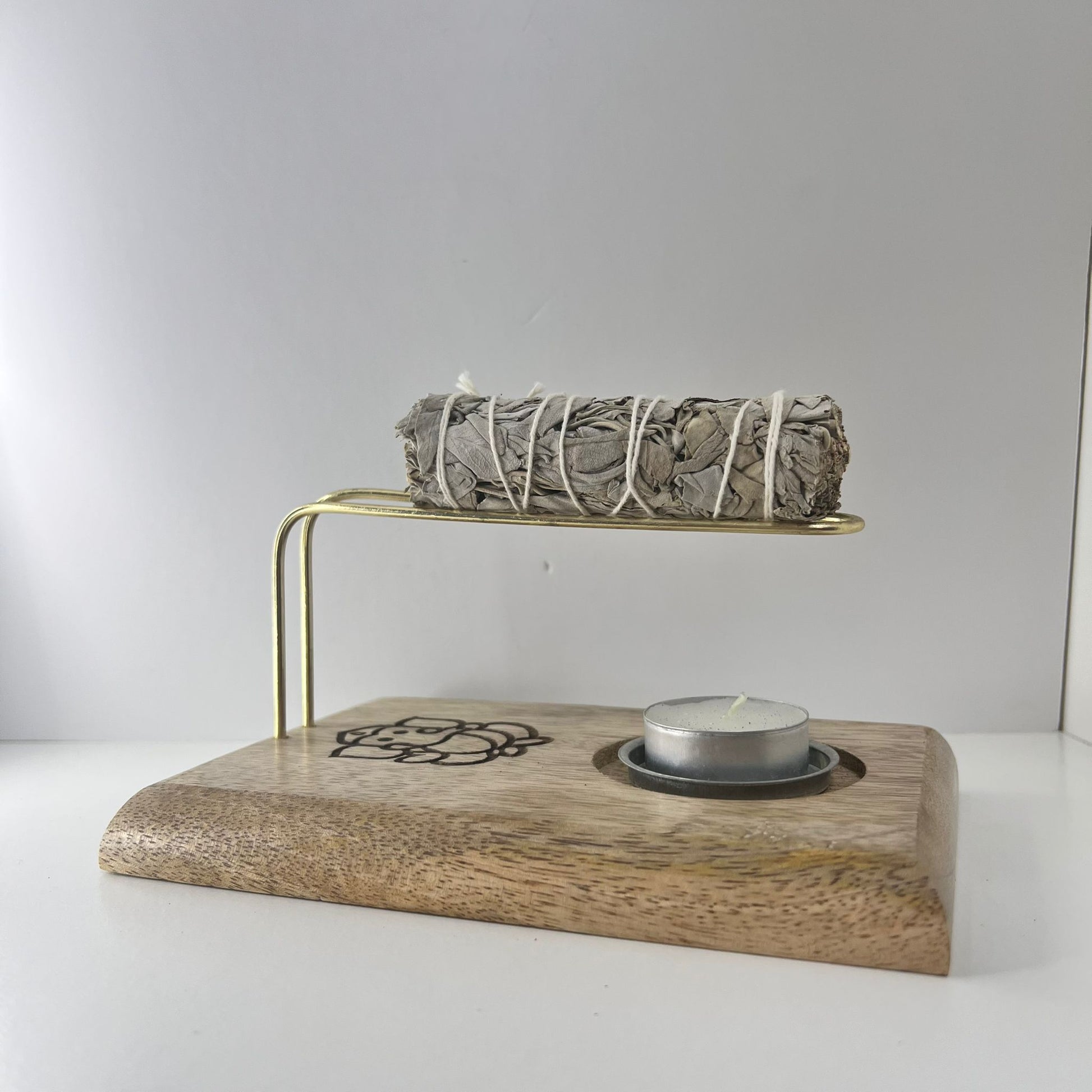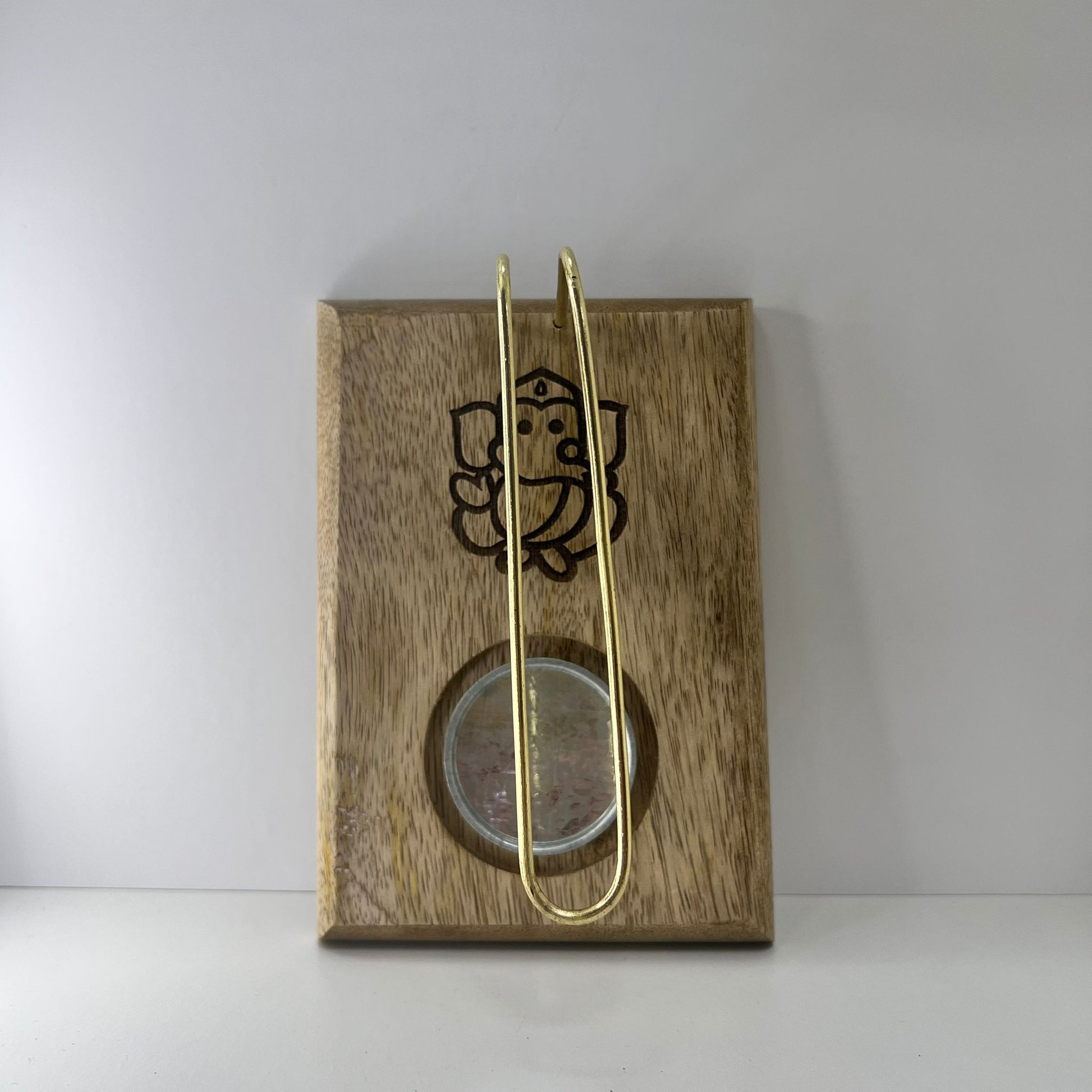 Un altar sencillo y poderoso formado por una base de madera grabada con la imagen de Ganesha guardián de los comienzos y removedor de obstáculos desde esa base surgen varillas que sostienen el sahumerio o el palo santo elevado como ofrenda al fuego una pequeña vela encendida debajo enciende su esencia liberando el humo que asciende como plegaria este quemador no es solo un instrumento es un puente entre lo humano y lo divino cada chispa de la vela despierta fragancias que purifican y cada trazo de Ganesha recuerda que la luz disipa la oscuridad y abre caminos de claridad y prosperidad