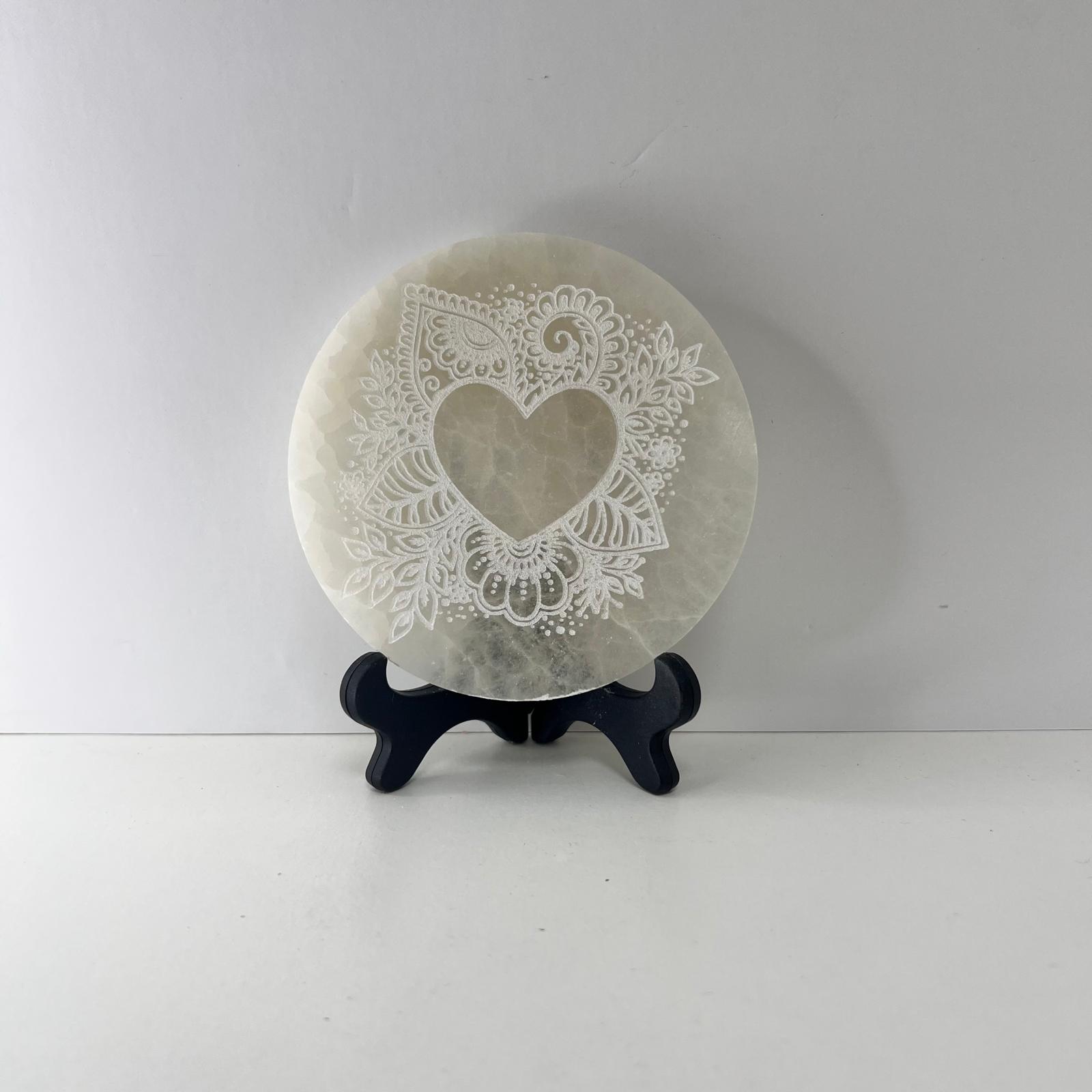 Selenita - Placa de Selenita de Mandala + Corazón Blanco