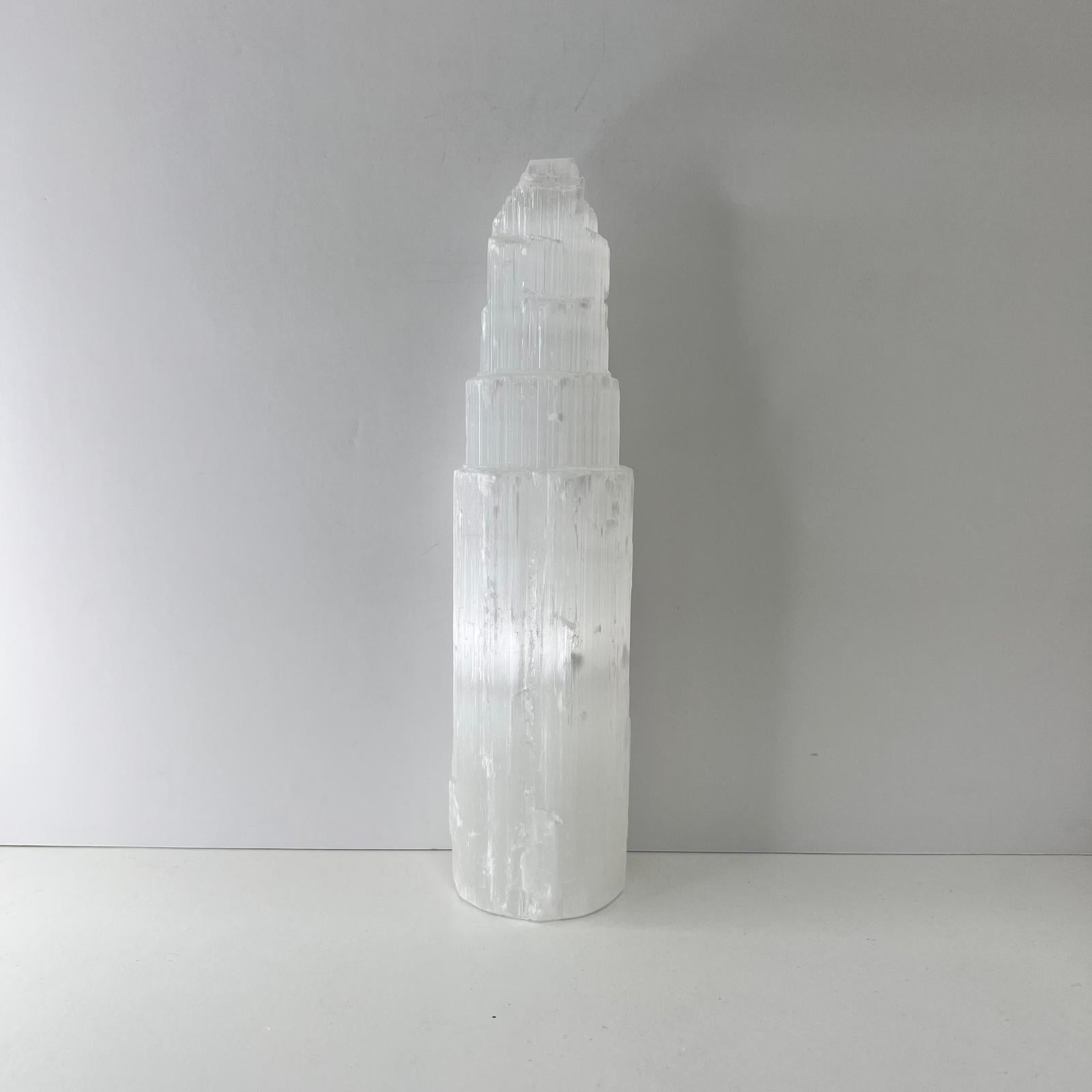 La selenita es un cristal translúcido de tono blanco perlado que se asocia con la pureza, la claridad mental y la conexión espiritual se considera una de las piedras más poderosas para limpiar y recargar energías tanto de personas como de objetos espirituales