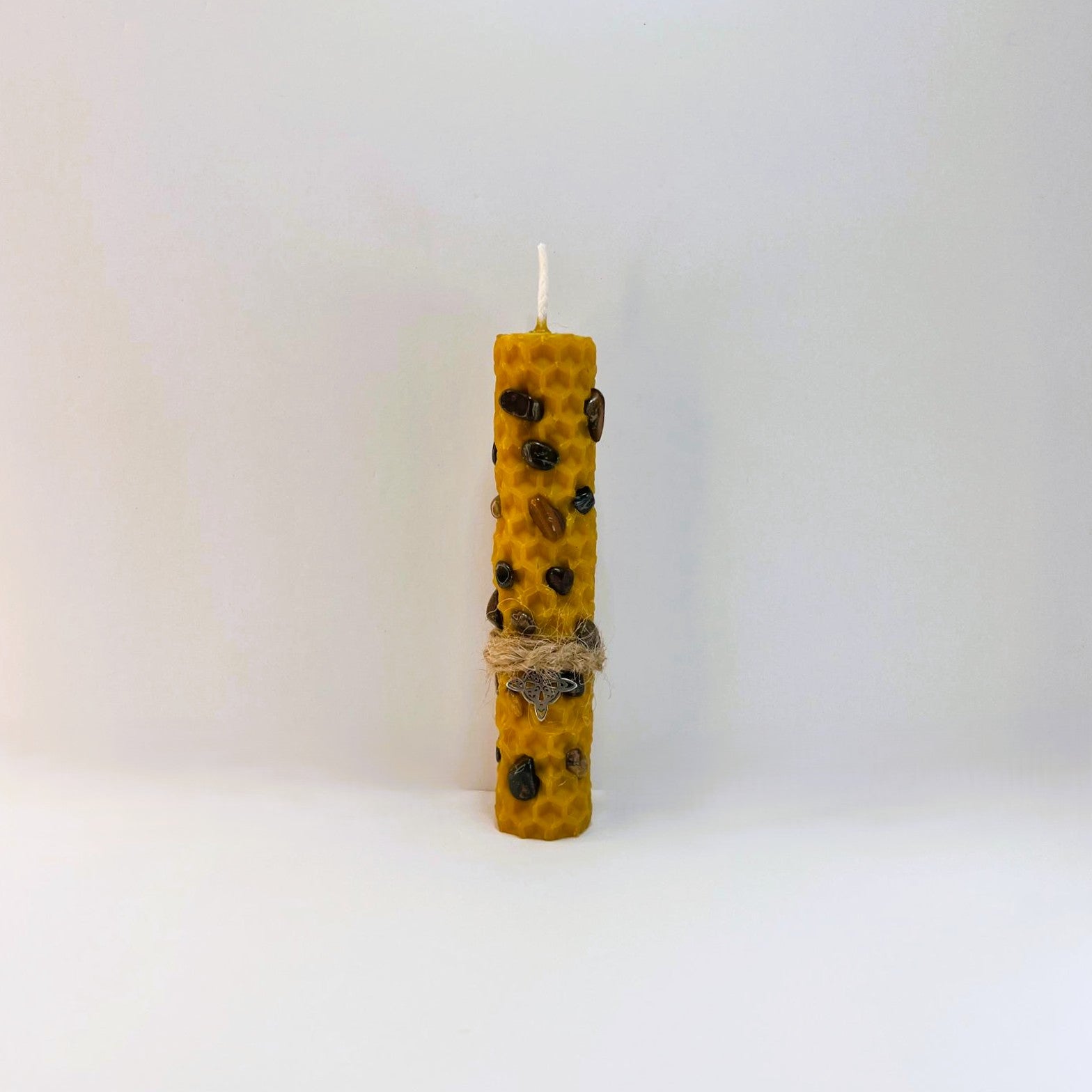 La vela artesanal de cera pura de abeja se transforma en un talismán vivo con las piedrecitas de ojo de tigre que recorren su cuerpo y un nudo de bruja de acero atado , cada piedra vibra con fuerza protectora, sus días sagrados son el 11 y el 22 momentos en que su energía se eleva naturalmente sin necesidad de palabras ni peticiones dejando que la luz y el calor de la cera despierten la fuerza interna la protección y la conexión con lo oculto y lo espiritual